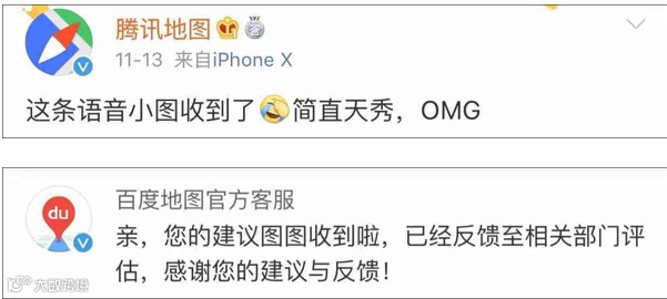 同时,粉丝们又给腾讯地图和百度地图提了相应的意见。这两家导航公司亦给出了回复。
