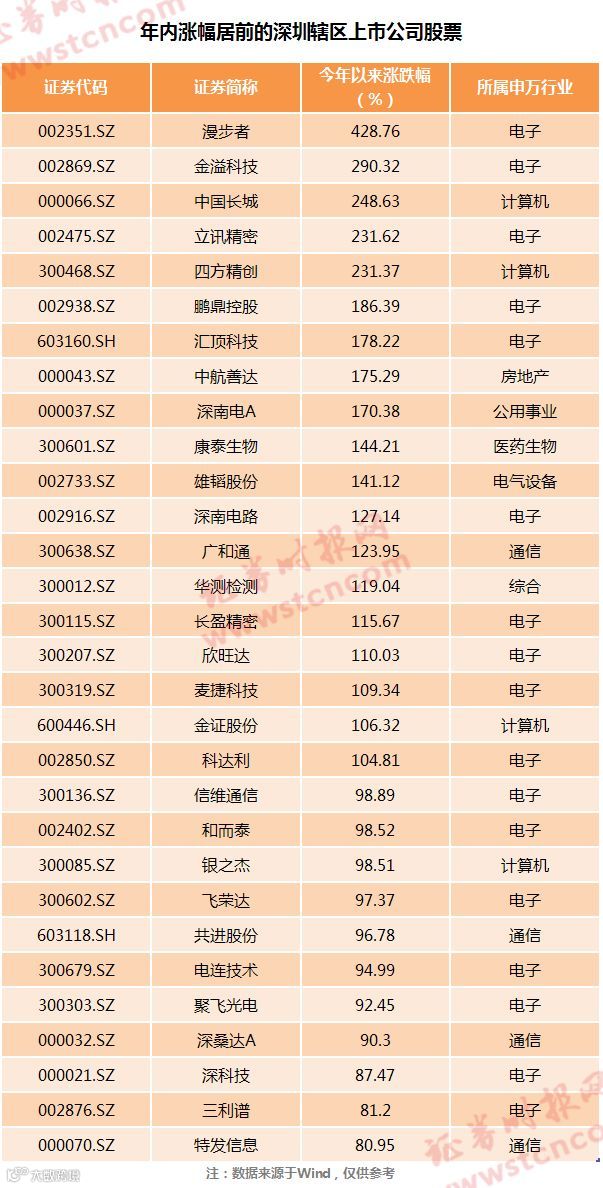 从具体股票看,据统计,今年以来共有约220只深圳本地股上涨,占深圳本地股总数的近3/4,其中有近20只股价翻倍。漫步者、金溢科技、中国长城、立讯精密、四方精创等年内涨幅超过200%,上述涨幅较大的股票主要集中在深圳竞争优势明显的泛科技行业,比如电子、计算机等行业。此外,深圳本地部分房地产、公用事业行业股票年内也有不错表现。