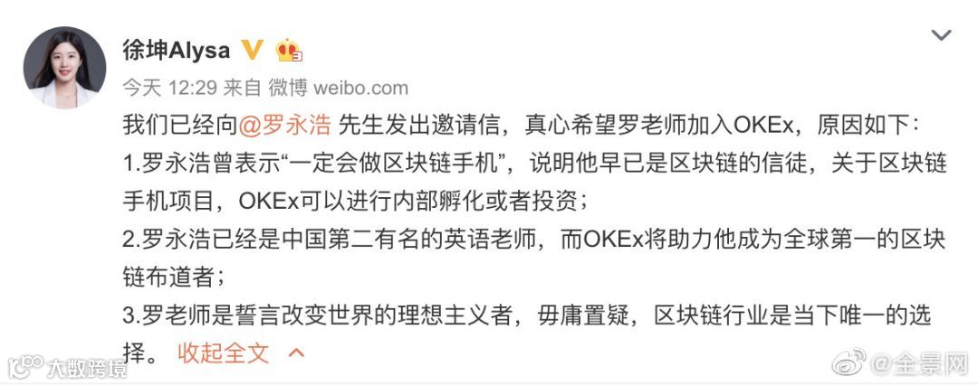 徐明星的合伙人、OKEx数字货币交易所首席战略官徐坤4日中午在微博上称,OKEx已经邀向罗永浩发出邀请,她表示:1.罗永浩曾表示“一定会做区块链手机”,说明他早已是区块链的信徒,关于区块链手机项目,OKEx可以进行内部孵化或者投资;2.罗永浩已经是中国第二有名的英语老师,而OKEx将助力他成为全球第一的区块链布道者;3.罗永浩是誓言改变世界的理想主义者,毋庸置疑,区块链行业是当下唯一的选择。