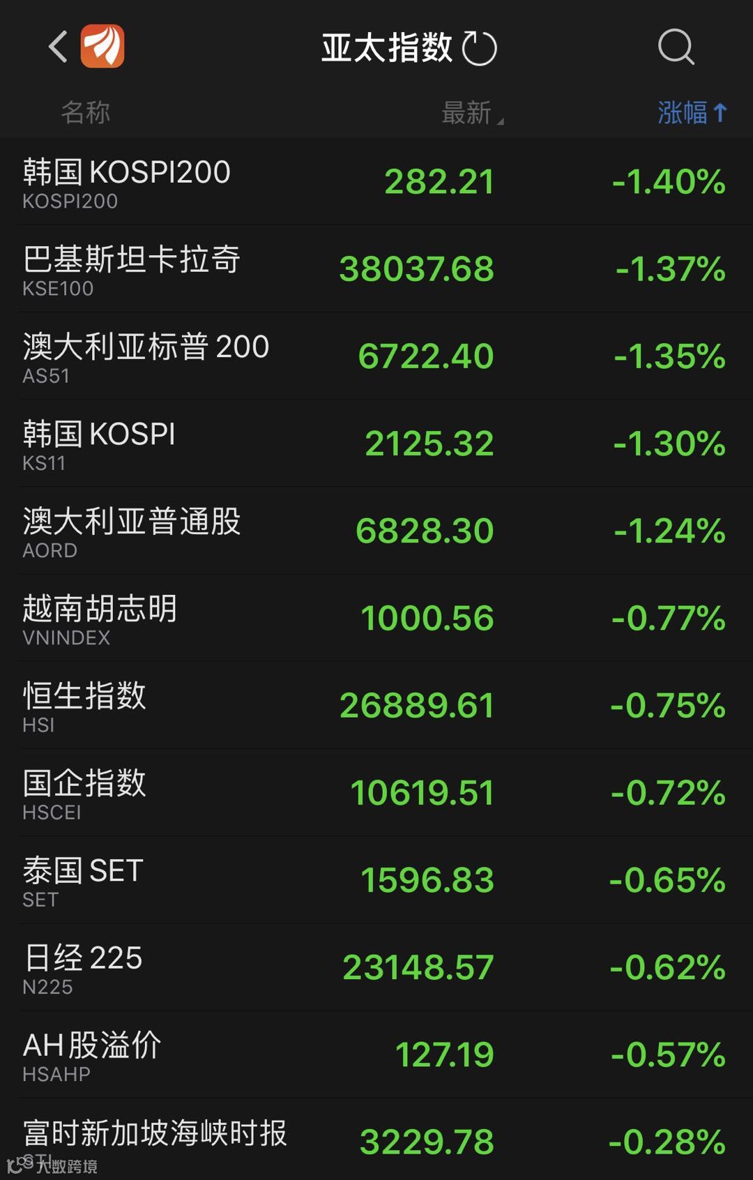 11月20日,亚太市场主要股市集体走势低迷。韩国、澳大利亚等股市跌幅超过1%,前一交易日还处强势的香港股市亦出现杀跌情况,恒指跌0.75%,国企指数跌0.72%。