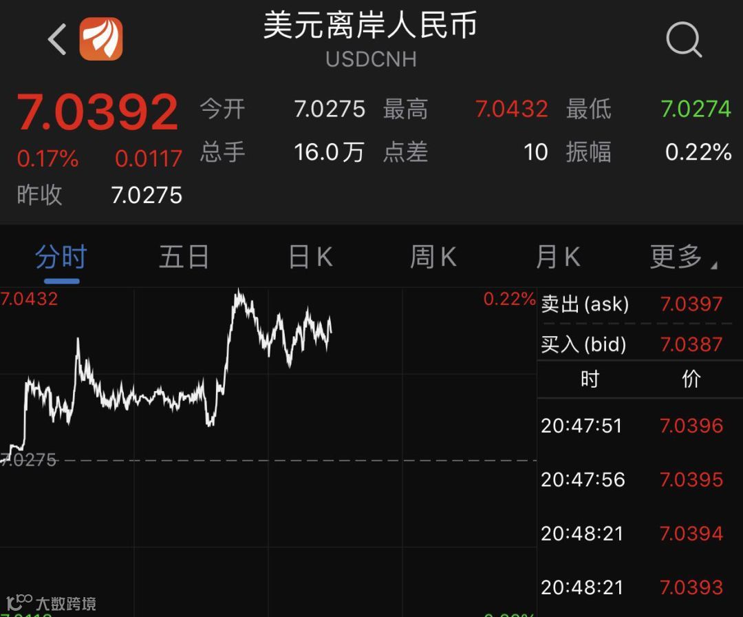 人民币走势亦走弱,日内贬值超过100点。