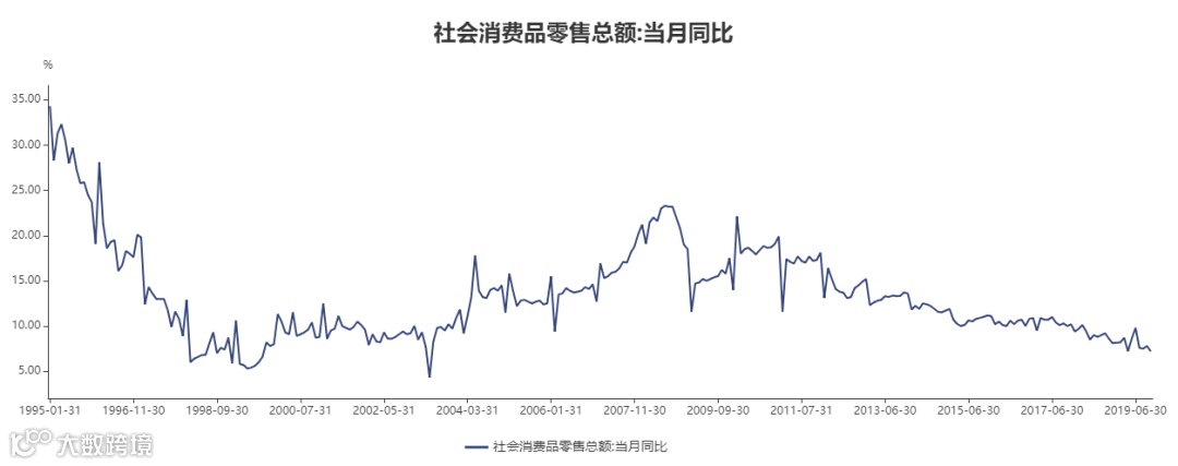 这可能是需求下降的一个缩影。而从全社会的消费品零售数据(据WIND数据)来看,其增速亦呈现连续下行的趋势。