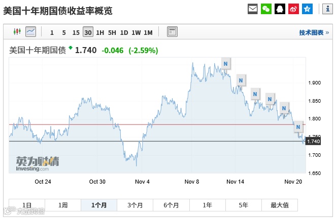 美国十年期国债收益率已经从11月8日的最高点至今,已经下跌了216个基点。