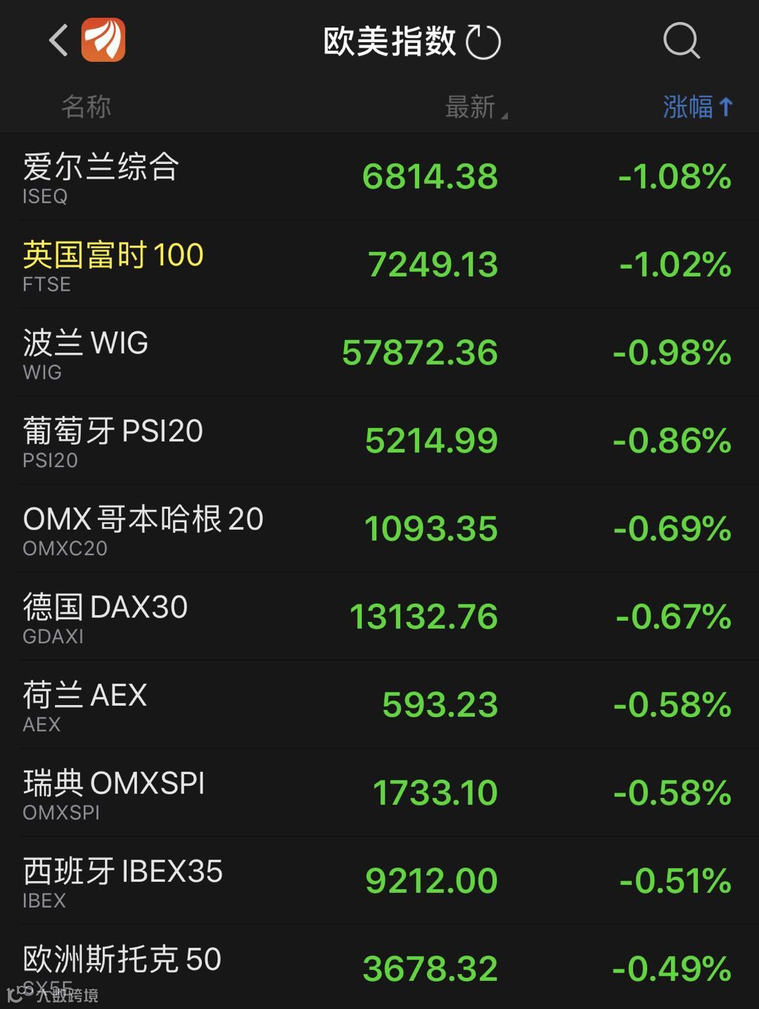 欧洲主要股指也集体陷入跌势,截至发稿时间,英国和爱尔兰市场跌幅皆超过1%。