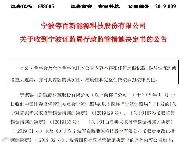 11月19日晚间,容百科技发布公告称,收到宁波证监局下发的行政监管措施决定书。在宁波证监局开出的“一拖三”的监管措施中,容百科技被采取责令改正的行政监管措施,公司董事长、财务负责人及时任董秘均被要求前往宁波证监局接受监管谈话。而其时任董秘已于9月30日离职。