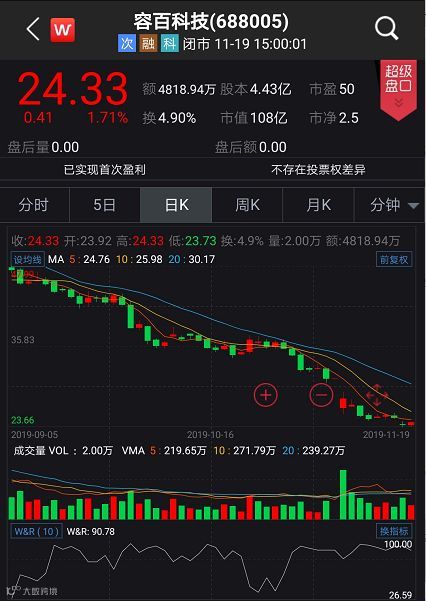 成功上市尚不足4个月,容百科技在市场上的热度已随着节气由夏转冬。在比克动力引发上市公司“连环雷”的局面公布后,即有投资者认为容百科技存在欺诈上市的嫌疑,其股价也一路下行直至破发。截至11月19日收盘,容百科技以24.33元/股报收,已连续破发一周以上。
