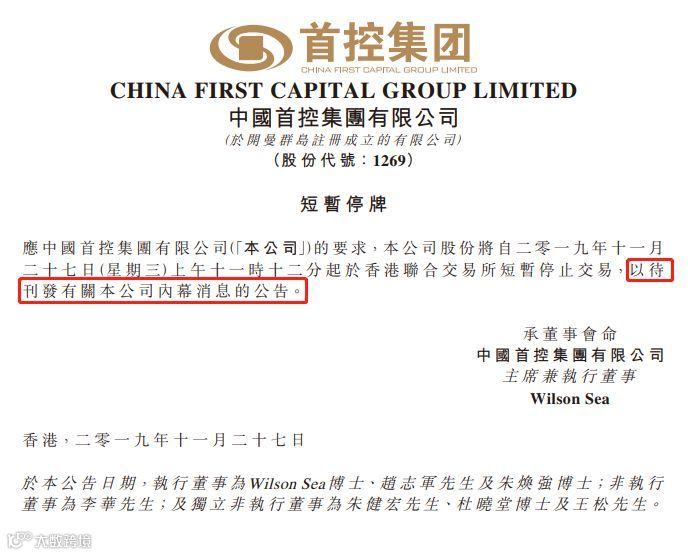 11月27日,首控集团由于闪崩变成港股市场的“仙股”,从11月26日每股1.82港元/股收盘价暴跌至0.45港元/股,大幅下跌75.27%,市值蒸发近70亿港元。因此,11月27日上午11时12分,首控集团采取了紧急停牌措施,并公告称“以待刊发有关公司内幕消息的公告”。不过,截至记者发稿时,尚未看到相关公告。
