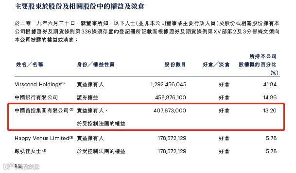 从首控集团股权来看,根据2019年中期报告,公司目前的第一大股东为创越、唐铭阳等一致行动人,合计持股8.04亿股,占总股本为16.0%,但其中的6.667亿股已经抵押给Champion Sense Global Limited,且在公司发行的可换股债券的转换权获全面行使后,还有244,648,318股股份将会配发予后者,而后者是中国华融旗下的全资子公司。