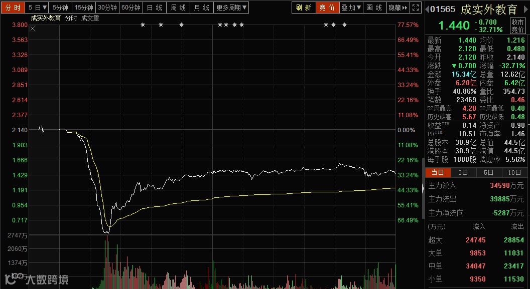 11月27日,成实外教育以2.12港元/股开盘后,9时50分开始大幅下跌,至10时18分大跌至0.495港元/股,最大跌幅达到76.87%,但后续有所收复,摆脱“仙股”阴影,截至收盘,成实外教育收于1.44港元/股,全天下跌32.71%。