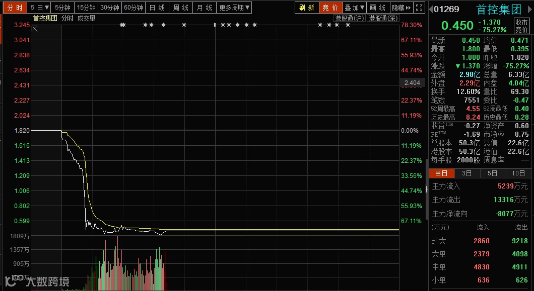 毫无征兆,11月27日首控集团(01269.HK)上午突然大跳水闪崩,大跌75.27%,收盘成仙股——0.45港元/股,市值仅剩下22.6亿港元,瞬间蒸发近70亿港元(约合62亿人民币),之后宣布短暂停牌。