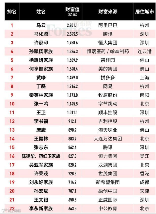 腾讯公司董事会主席兼首席执行官马化腾排名第2位,身家为2545.5亿元;恒大集团董事局主席许家印排名仍为第3位,身家为1958.6亿元,因此,富豪榜上前三的排名与去年一致。