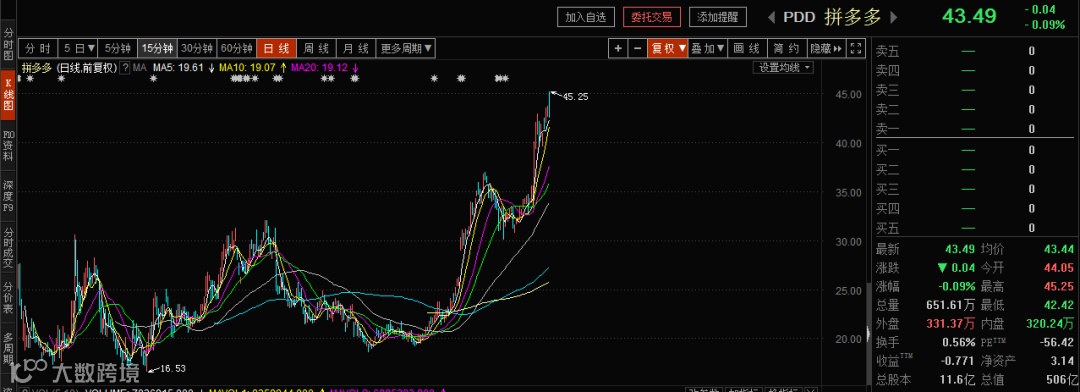 与对手京东相比,拼多多在股市方面表现优秀,以去年11月7日和今年11月7日股价对比,拼多多股价上涨了109.8%,拼多多CEO黄峥的身家也从去年的776.3亿元增长至今年的1499亿元,黄峥的排名上升了五位,晋级富豪榜第七。