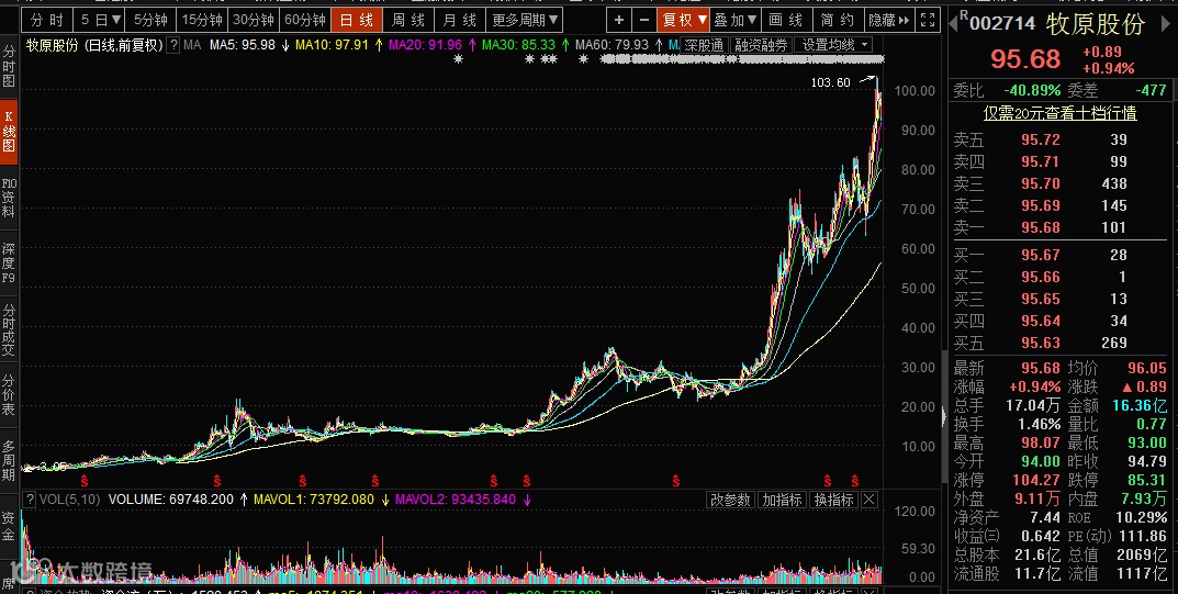 记者注意到,牧原股份今年以来股价创下历史新高103.6元/股,年初股票价格为28.66元/股,以11月7日收盘价计算,牧原股份今年上涨了233.84%。