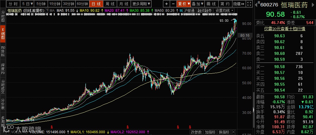 券商中国记者注意到,孙飘扬家族财富从去年的717亿元上升至1824.3亿元,与之对应的,恒瑞医药的股价在今年创下历史新高,今年以来上涨106%。