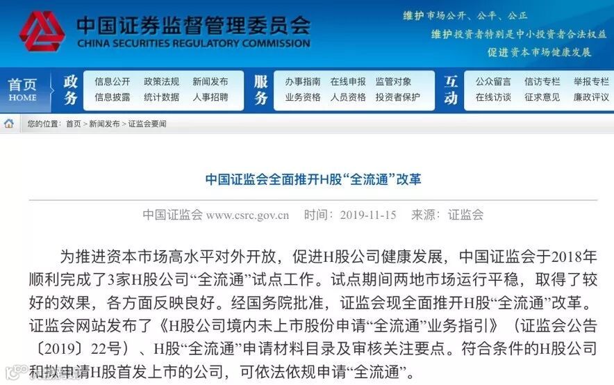 2019年11月15日,证监会宣布全面推开H股“全流通”改革。记者注意到,相关业务指引和审核关注要点均已挂网,符合条件的H股公司和拟申请H股首发上市的公司,可依法依规申请“全流通”。