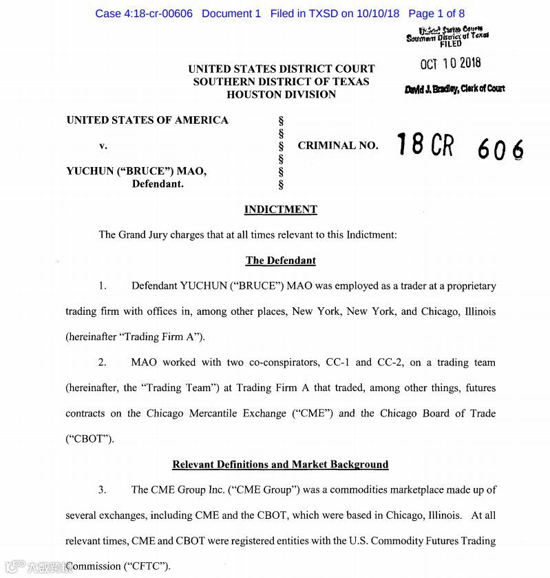 在此案爆发之前,2018年8月份,CME就曾给Bruce Mao一则纪录处分,禁止交易两年,并处以12万美元罚款。但是,随后案件移送到美国司法部,2018年10月份,美国司法部开始正式指控。