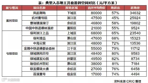 值得注意的是,盈利的地王还是少数,七成入市地王面临亏损。克而瑞研究中心指出,这部分项目地房比多在65%以上。其中,位于拱墅区的绿城建发沁园表现最为突出,该项目土地在2017年1月被绿城以31亿元的价格竞得,楼板价高达40766元/平方米,2018年10月首开,首开平均售价49500元/平方米,地房比高达82%,房地差仅有8734元/平方米,亏损十分严重。