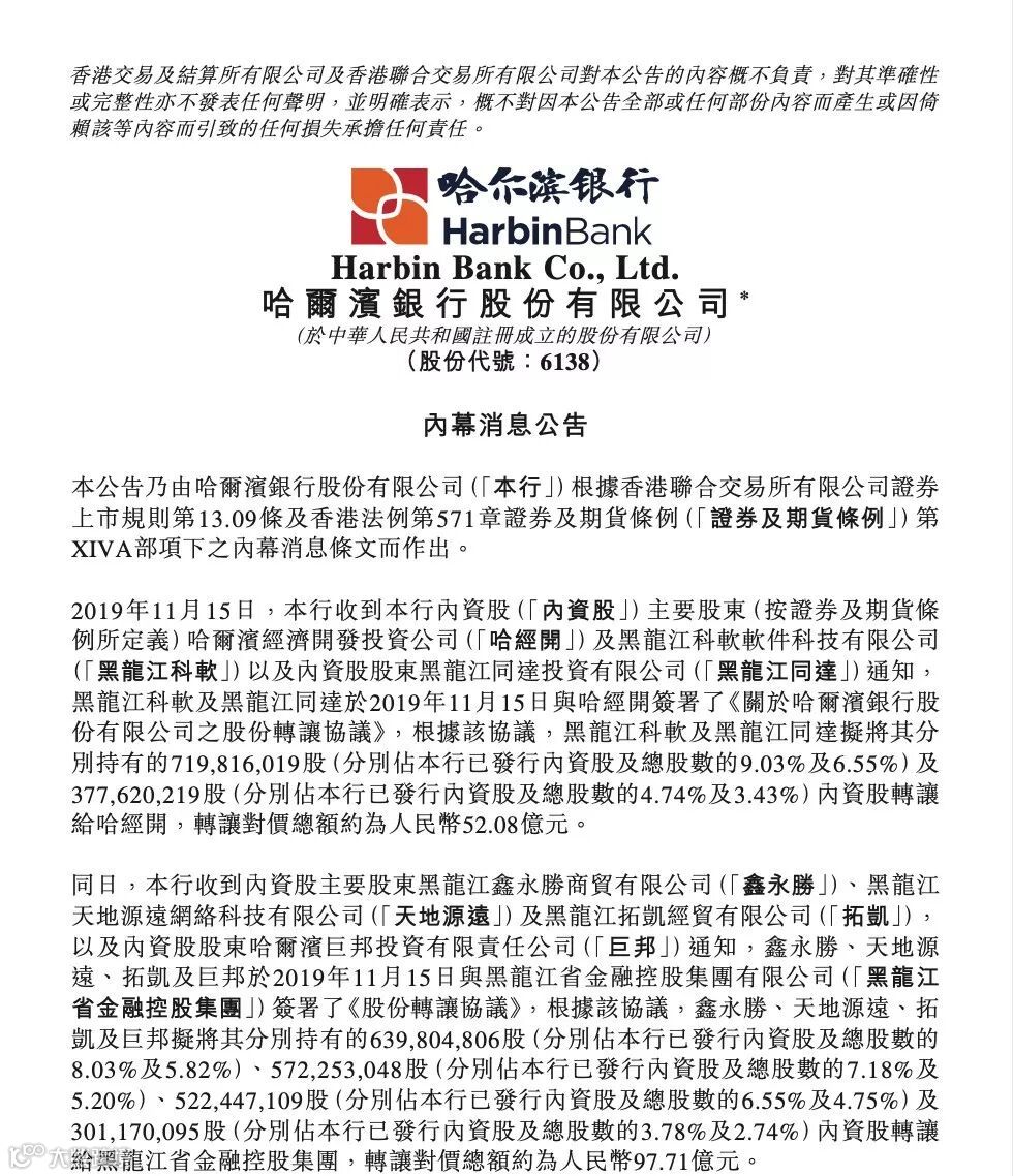此外,鑫永胜、天地源远、拓凯及巨邦拟将其分别持有的6.4亿股(占总股本的5.82%)、5.72亿股(占总股本的5.2%)、5.22亿股(占总股本的4.75%)及3.01亿股(占总股本的2.74%)内资股转让给黑龙江省金融控股集团,转让对价总额约为人民币97.71亿元。