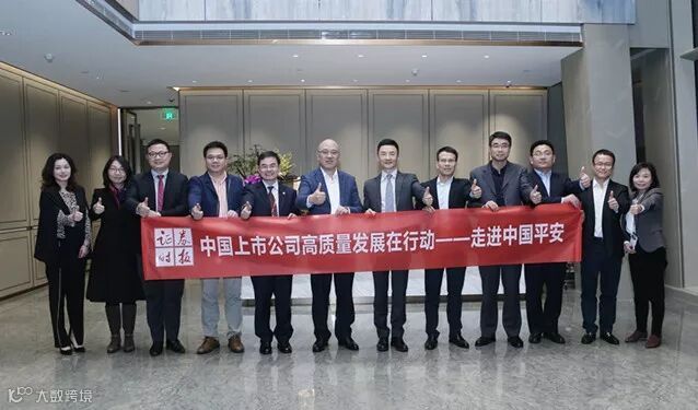 图1:证券时报社社长兼总编辑何伟(左六),证券时报社常务副总编辑周一(右五)带采访团走进中国平安股份有限公司。