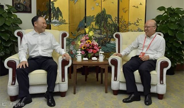 图2:何伟对话吉利汽车控股有限公司董事长李书福(左)。