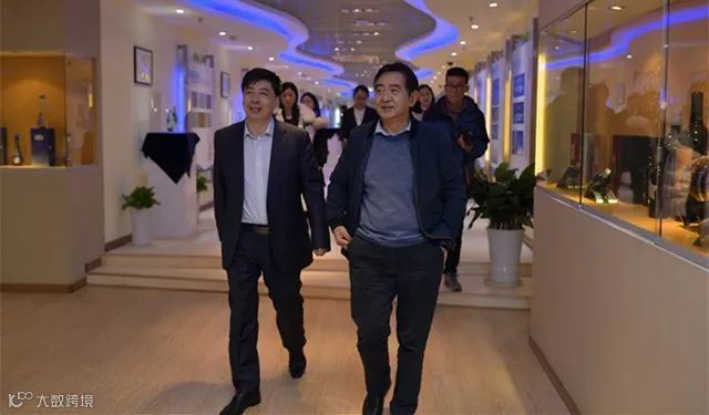 图5:证券时报社副总编辑高峰(右)在洋河股份董事长王耀的带领下走进洋河股份展厅。