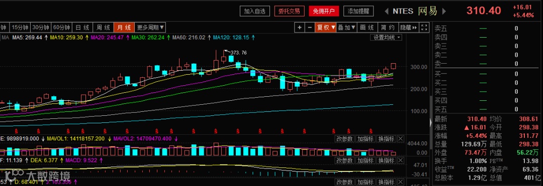 那么,网易究竟怎么了?从股价情况来看,目前还看不出该公司有要发生大事的征兆。目前,网易的股价仍在次高位,月线仍在上升通道之中,股票市值高达400亿美元,折合人民币近2800亿元。