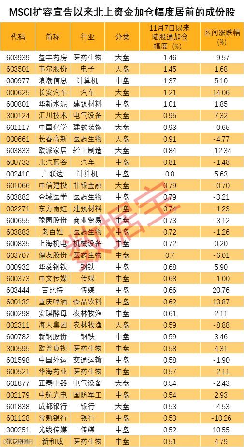 对于下周MSCI年内最大规模的扩容,北上资金已提前开始布局。数据宝统计显示,11月7日MSCI公布年内第三次扩容成份股名单以来,北上资金已对近八成中盘成份股进行了加仓,超六成成份股的加仓幅度超过0.1%。