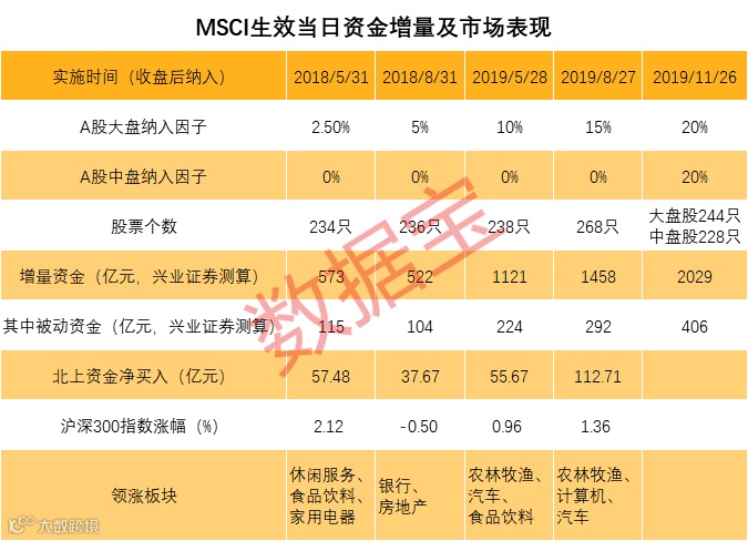 证券时报·数据宝统计显示,从市场表现来看,去年以来MSCI四次纳A,扩容生效当日沪深300指数有三次上涨,平均涨幅1%,银行地产、食品饮料、农林牧渔行业涨幅最高。MSCI生效当日被动资金的流入和市场积极情绪共振,大盘普遍能够获得较高的正收益。同时,扩容生效日北上资金均呈现出了大规模净流入,其中8月27日净流入金额高达112亿元,为年内第二高。