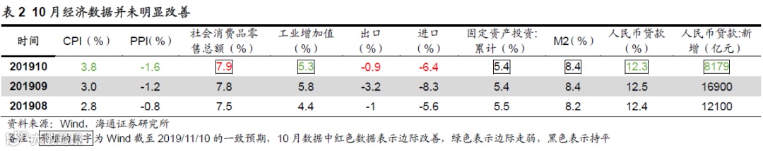 货币政策上,10月21日LPR利率未下调,11月5日央行下调MLF利率5bp至3.25%,此次MLF利率下调宽松的意义还不够,更多的是缓解市场对10月第4周TMLF缺席的担忧,后续货币政策动向观测时间点是12月6日、12月14日MLF到期续作情况及11月20日左右LPR利率。财政政策方面,9月初国务院常务会议提出根据地方重大项目建设需要,按规定提前下达明年专项债部分新增额度,目前还未得到确切报告具体多少额度,后续需要跟踪具体额度及落地情况。改革方面, 12月初跟踪中央政治局会议,12月中旬跟踪中央经济工作会议。