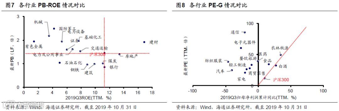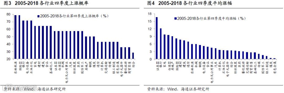 此外,从单纯的统计规律看,我们在报告《历史上四季度各行业胜率回顾-20191018》中统计过2005-2018年第四季度各行业上涨的概率和平均涨幅:21个行业上涨概率超过50%,其中上涨概率较高的行业为:农林牧渔(79%)、保险Ⅱ (79%)、银行(71%);所有行业历史平均四季度涨幅均大于0%,其中涨幅居前的行业为:证券Ⅱ(16.7%)、银行(12.2%)、家电(9.8%),银行四季度胜率高。