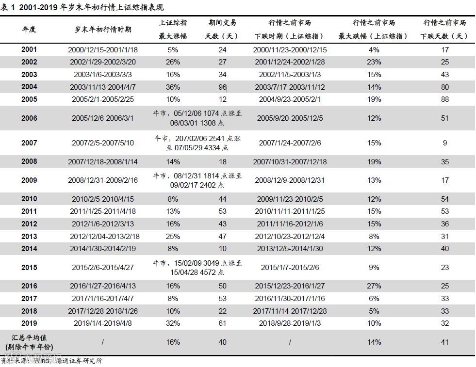 季节规律:岁末年初行情不会缺席,现在布局。临近岁末,投资者开始关注岁末年初行情。我们在上周周报《等待转机-20191103》中回顾过2001年以来A股岁末年初的行情,发现各年差异较大,行情有早有晚,但从未缺席。回顾历史,行情最早11月中启动,最晚2月初启动,启动时间早晚往往与上年三四季度行情有关,三四季度行情较好,则启动时间较晚,具体如,2002、2005、2010、2011、2014、2016年,三四季度行情较弱,则启动偏早,具体如2001、2004、2008、2013年。行情持续时间最长96个交易日,最短仅10个交易日,平均为40天(剔除牛市年份,下同)。期间上证综指涨幅最大36%,最小5%,平均16%。