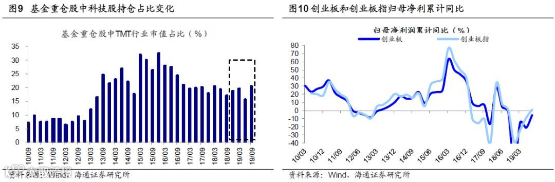 而每轮牛市主导产业都符合时代背景,“科技+券商”有望成为本轮主导产业。科技股业绩回升的动力是政策红利、技术进步。政策面产业政策向科技倾斜,前期科创板、融资放开等举措将带动VC/PE为科技企业注入增量资金。最新公布三季报数据显示创业板代表科技类行业盈利已经企稳,19Q3/19Q2/19Q1创业板剔除温氏股份乐视网后归母净利润累计同比为0.3%/-6.2%/-7.5%,扣非后创业板净利润累计同比为46.4%/26.4%/1.2%。11月8日,证监会就修改部分再融资规则公开征求意见,旨在提升包括创业板在内各公司进行再融资的门槛。再融资新规若推出将有利于科技企业进行股权融资,随着5G等新技术的推广应用,科技股ROE将有望得到进一步改善。在19Q3基金重仓股(剔除港股)中TMT市值占比环比大升4.6个百分点至20.6%,仍低于2013年以来的均值22%,目前处于13Q2-Q3水平,而历史最高点为15Q4的32.5%,详见《科技占比明显上升——基金2019年三季报点评-20191025》。