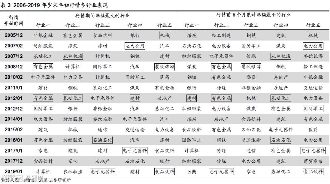 季节规律:岁末年初行情往往滞涨的补涨。岁末年初行情有早有晚,但从未缺席。回顾历次岁末年初行情中各个行业的表现,我们发现行情中上涨较多的行业往往是前期涨幅较少的行业,即滞涨的补涨。我们统计了2006-2019年14次岁末年初行情中涨幅最大的五个行业及行情启动前6个月涨幅最小的5个行业,比如今年初的行情从2019/01/04开始至2019/04/08结束,期间涨幅最大的五个行业分别为计算机(59%)、农林牧渔(59%)、电子元器件(51%)、建材(50%)、食品饮料(50%),而从行情开始往前推6个月,即2018年整个下半年,涨幅最小的五个行业分别是医药(-28%)、电子元器件(-24%)、家电(-20%)、基础化工(-20%)与食品饮料(-19%)。电子元器件从跌幅第2跃升为涨幅第3,食品饮料从跌幅第5跃升为涨幅第5。其余各年情况详见表2。今年下半年以来至今(截至2019/11/08)四个多月涨幅最小的五个行业分别是钢铁(-13%)、有色金属(-10%)、建筑(-9%)、煤炭(-9%)与商贸零售(-8%),银行和地产涨幅也不高,分别只有6%与-3%。