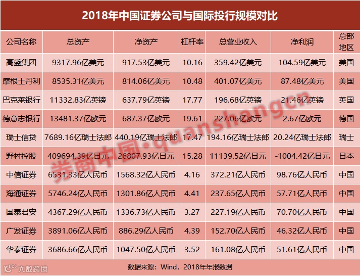 “资本金是中国券商的一个坎,数百年积攒下来的净资本无法相比,只能靠时间和积累。在双方杠杆率严重不对等、净利润、净资产差距巨大的情况下,可动用资金完全不在一个级别上。”有券商资深人士笑称,“4倍杠杆和10倍或20倍杠杆比拼,就好像用小米加步枪对抗飞机大炮。”
