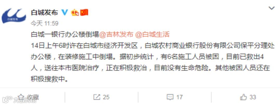 吉林白城农商行(全称:白城农村商业银行股份有限公司)一办公楼倒塌,正全力施救。
