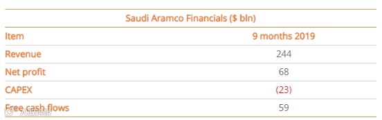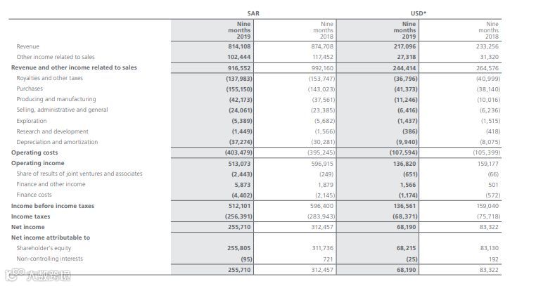 在刚刚公布的沙特阿美公司2019年第三季度季报来看,公司前9个月净利润达到680亿美元,销售收入2440亿美元,自由现金流为590亿美元。
