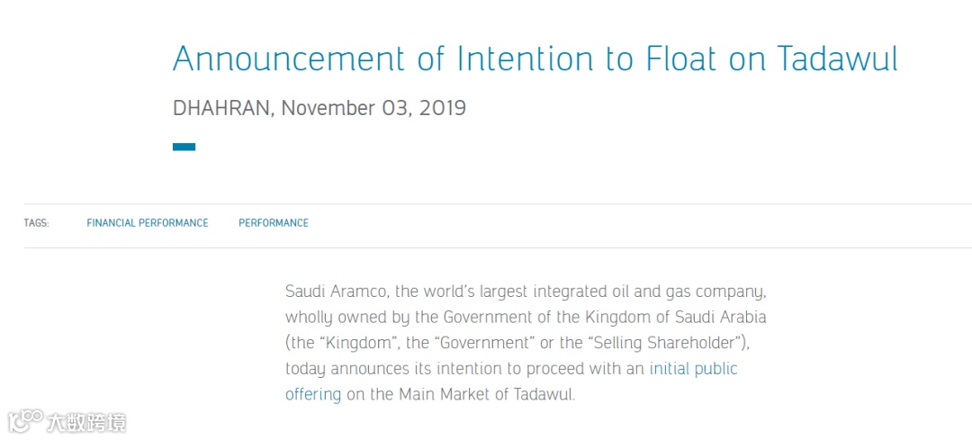 11月3日,世界最大石油企业——沙特阿美石油公司宣布已经获准了在沙特利雅得证券交易所上市的申请。