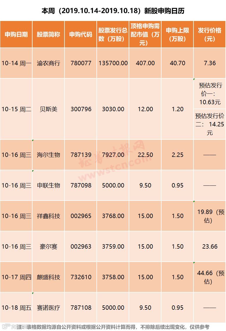 根据目前公开资料,本周初步预计将有8只新股申购,其中周一渝农商行,周二贝斯美,周三有海尔生物 、申联生物 、祥鑫科技、豪尔赛4只新股申购,是本周可申购新股数最多的一天,周四和周五则分别有麒盛科技、赛诺医疗各一只新股申购。