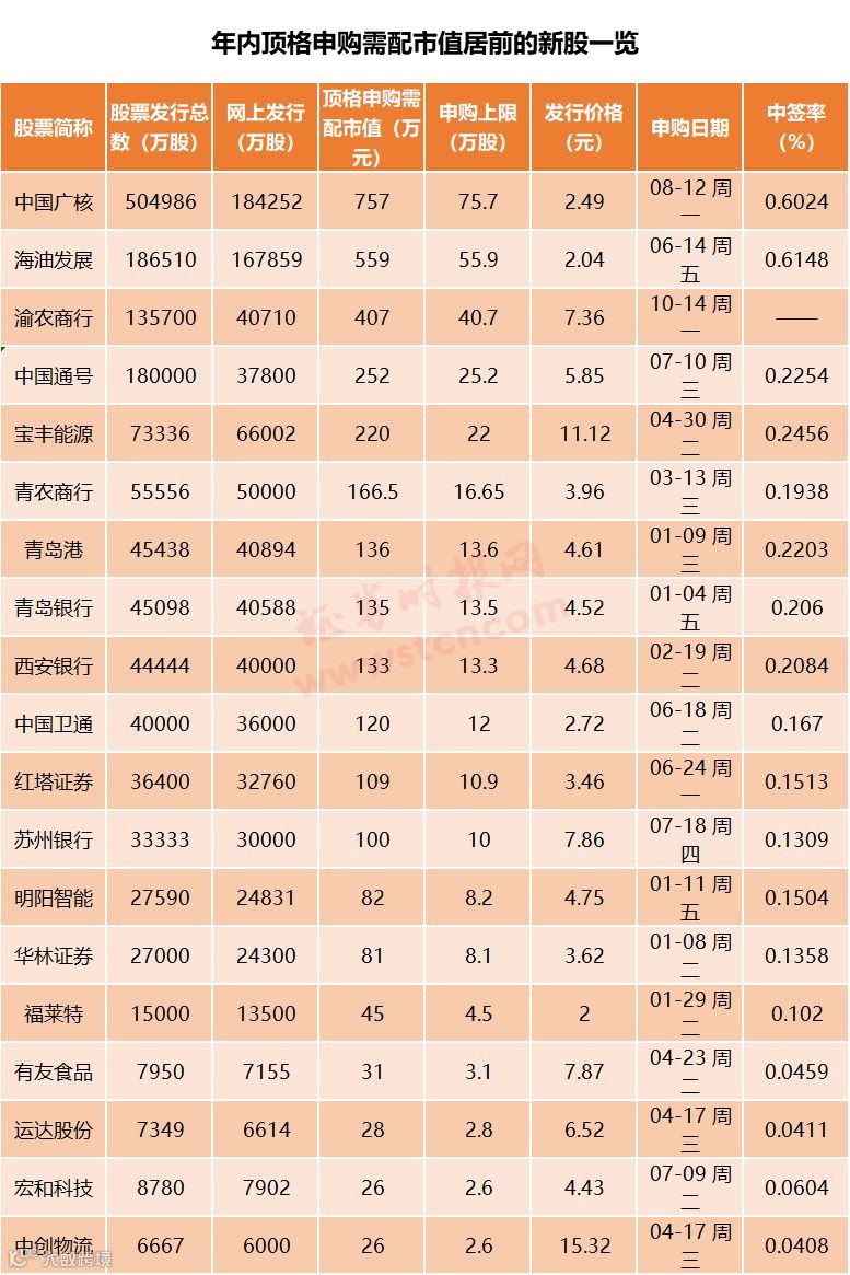 数据显示,今年以来发行规模最高是中国广核,该股发行数量18.4252亿股,于今年8月12日申购,中国广核的网上顶格申购所需市值为757万元,中签率为0.6024%。排名其后的今年6月申购的海油发展,顶格申购所需市值亦为559万元,中签率则为0.6148%。实际上,上述两股也年内迄今,中签率最高的两只新股。这意味着渝农商行有望成为年内中签率第三高的新股,也望成为在中国广核后,最近两个月中签率最高的新股。