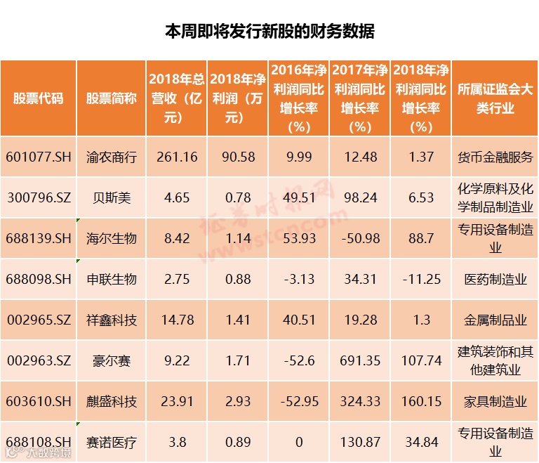 经营和财务数据上,8家新股公司中,渝农商行最高,2018年总营收达261.16亿元,申联生物最低,仅为2.75亿元。
