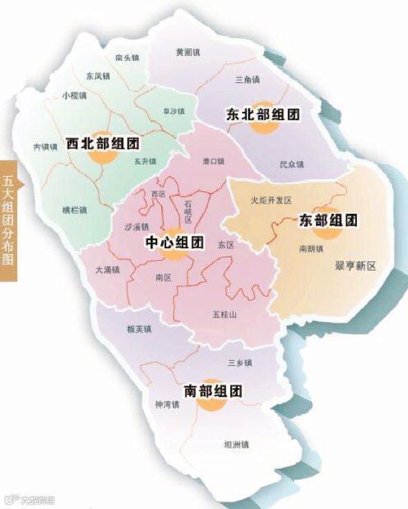 1、2017年4月份,中山市下发了《中共中山市委 中山市人民政府关于实施组团式发展战略的意见》将中山25镇区分为五大组团,包括中心组团、东部组团、东北部组团、西北部组团和南部组团。