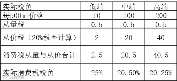 (2)2001年,税负进一步提高。改为从价、从量复合征税,增加从量税,且取消了外购酒抵扣政策,并停止执行对小酒厂(会计核算不健全的小型业户)定额、定率的双定征税办法,一律实行查实征收。部分低端产品的实际消费税率由此大增至30%以上;