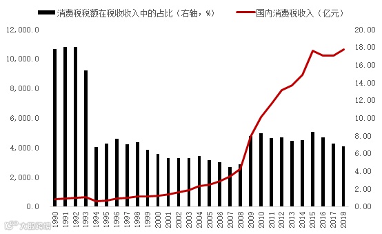 根据财政部公布的数据,2018年全年,消费税收入约为10632亿元,约占全部税收收入比重的6.8%,连续四年占比回落。