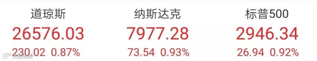 美股低开高走,三大股指全线飘红,截至发稿,道琼斯指数涨0.87%报26576.03;纳斯达克涨0.93%报7977.28;标普500涨0.92%报2946.34。