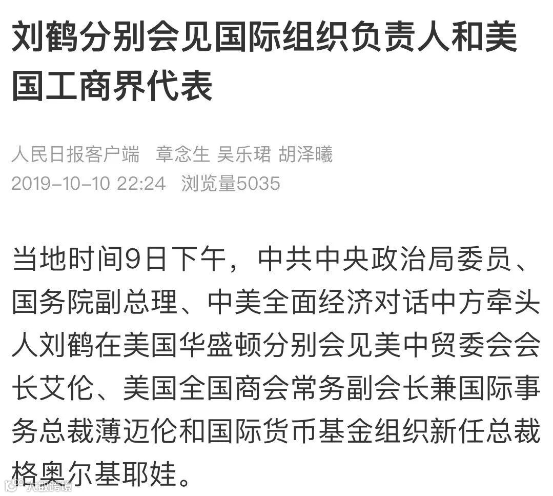 刘鹤在会见格奥尔基耶娃时表示,即将举行的新一轮经贸高级别磋商受到各方面高度关注,停止贸易战是整个世界的共同期盼。中方愿意在平等和相互尊重的基础上,与美方通过本轮磋商就一些双方关注的问题取得共识,防止摩擦进一步升级和扩散。希望国际社会共同努力,维护世界稳定与繁荣。