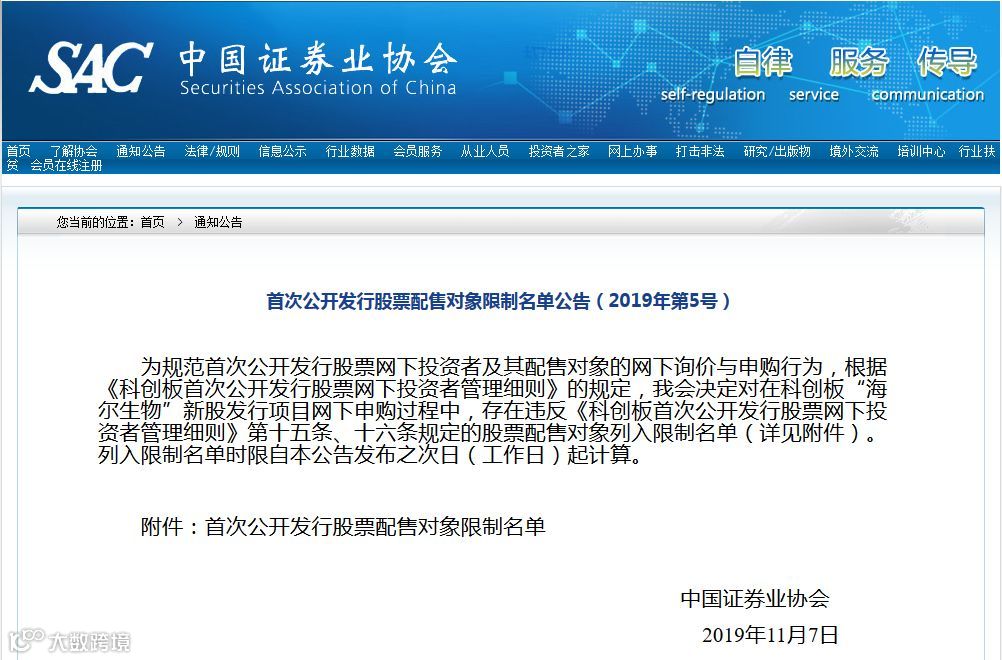 日前,中证协发布第5号首发股票配售对象限制名单公告,将在科创板“海尔生物”新股发行项目网下申购过程中存在违反相关规定的股票配售对象“望正基石投资一号基金”列入限制名单,时间为6个月。