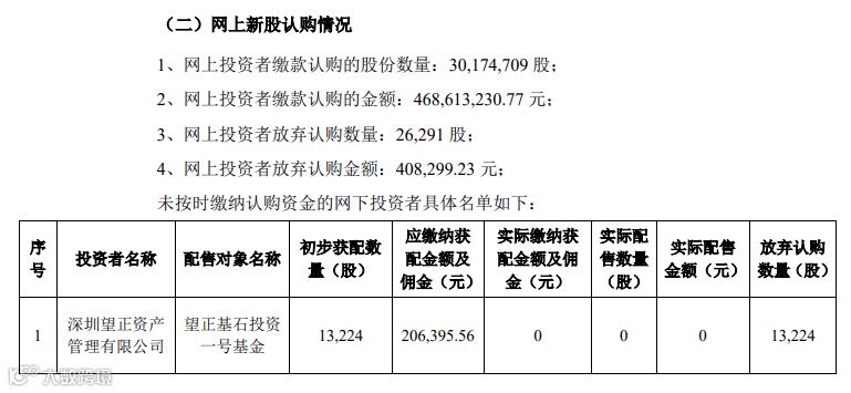 在网上新股认购情况中,海尔生物公布未按时缴纳认购资金的网下投资者名单,仅有“望正基石投资一号基金”一只产品在列。具体而言,基石一号初步获配数量为13224股,应缴纳获配金额及佣金20.64万元。对此,基石一号全部放弃认购。
