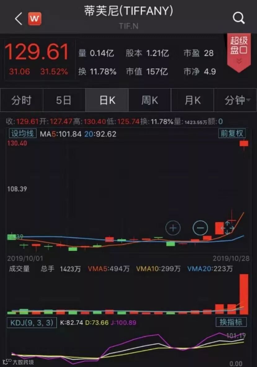 然而据外媒消息,Tiffany认为这一报价并未体现其实际价值,或将拒绝此次要约。受此影响,Tiffany盘前暴涨29%,美股开盘后,Tiffany继续上扬,一度上涨逾30%,已然超过120美元的收购价。