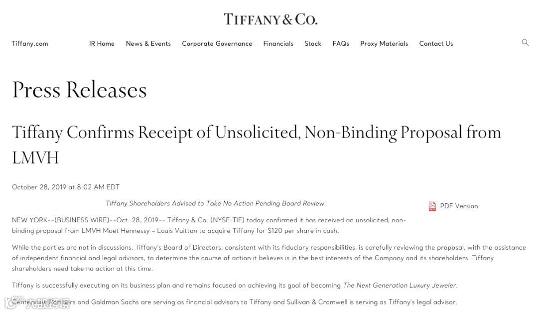随后美国东部时间28日早8点,Tiffany在官方网站证实,收到了来自LVMH的一份未经请求的非约束性要约,以每股120美元的价格现金收购蒂芙尼。