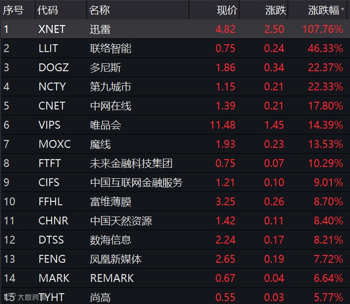 中概股全线狂飙,除了迅雷大涨107.8%,联络智能大涨46.33%,多尼斯、第九城市涨逾20%,中网在线、唯品会、魔线和未来金融科技集团涨逾10%。